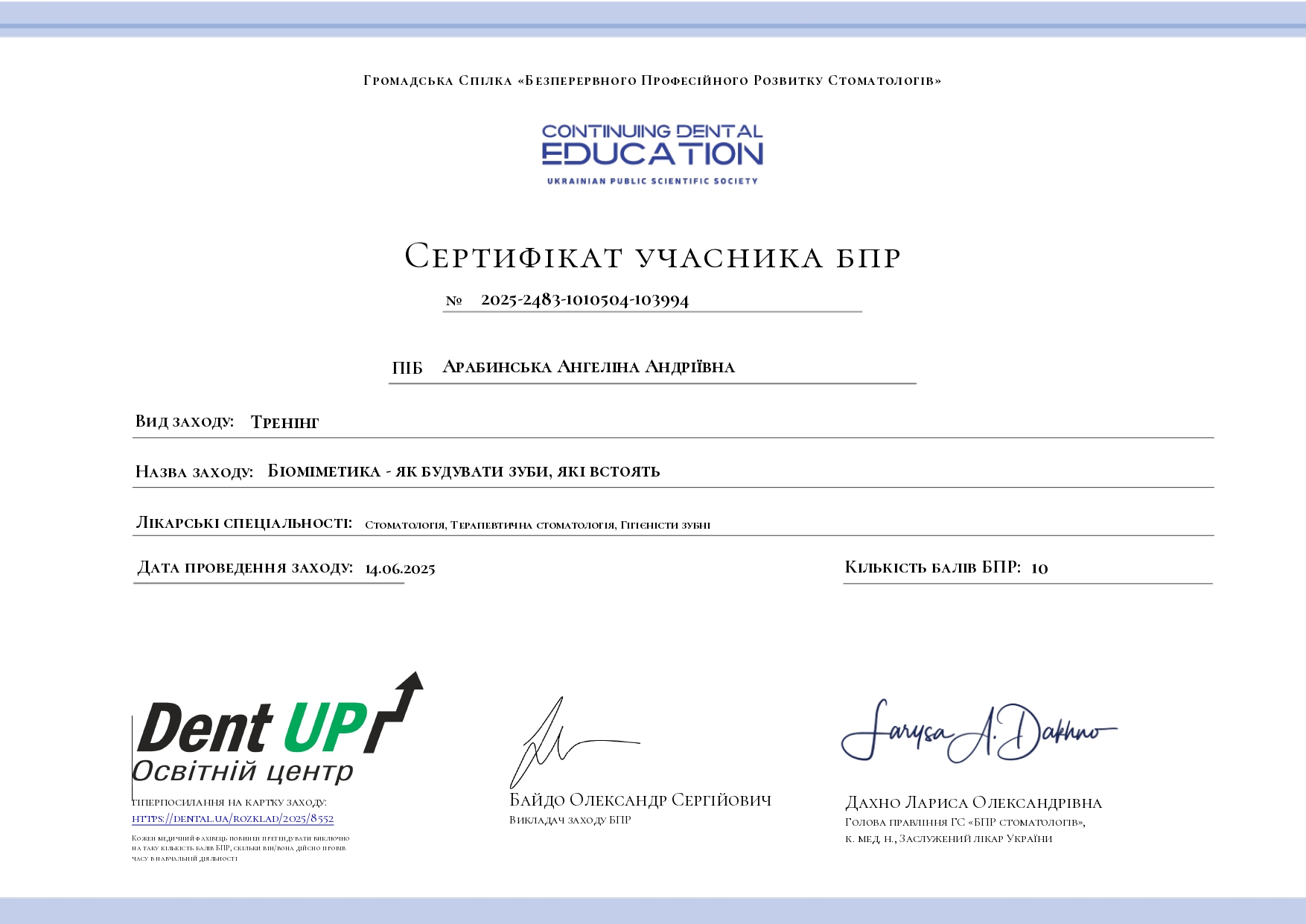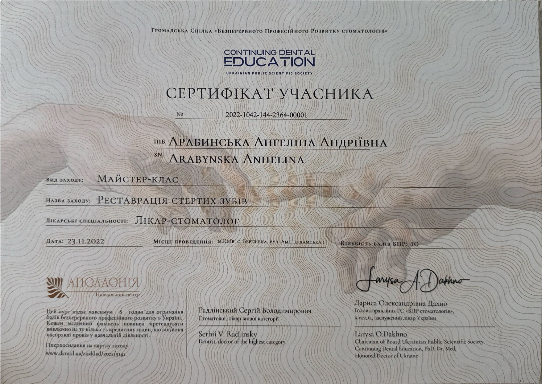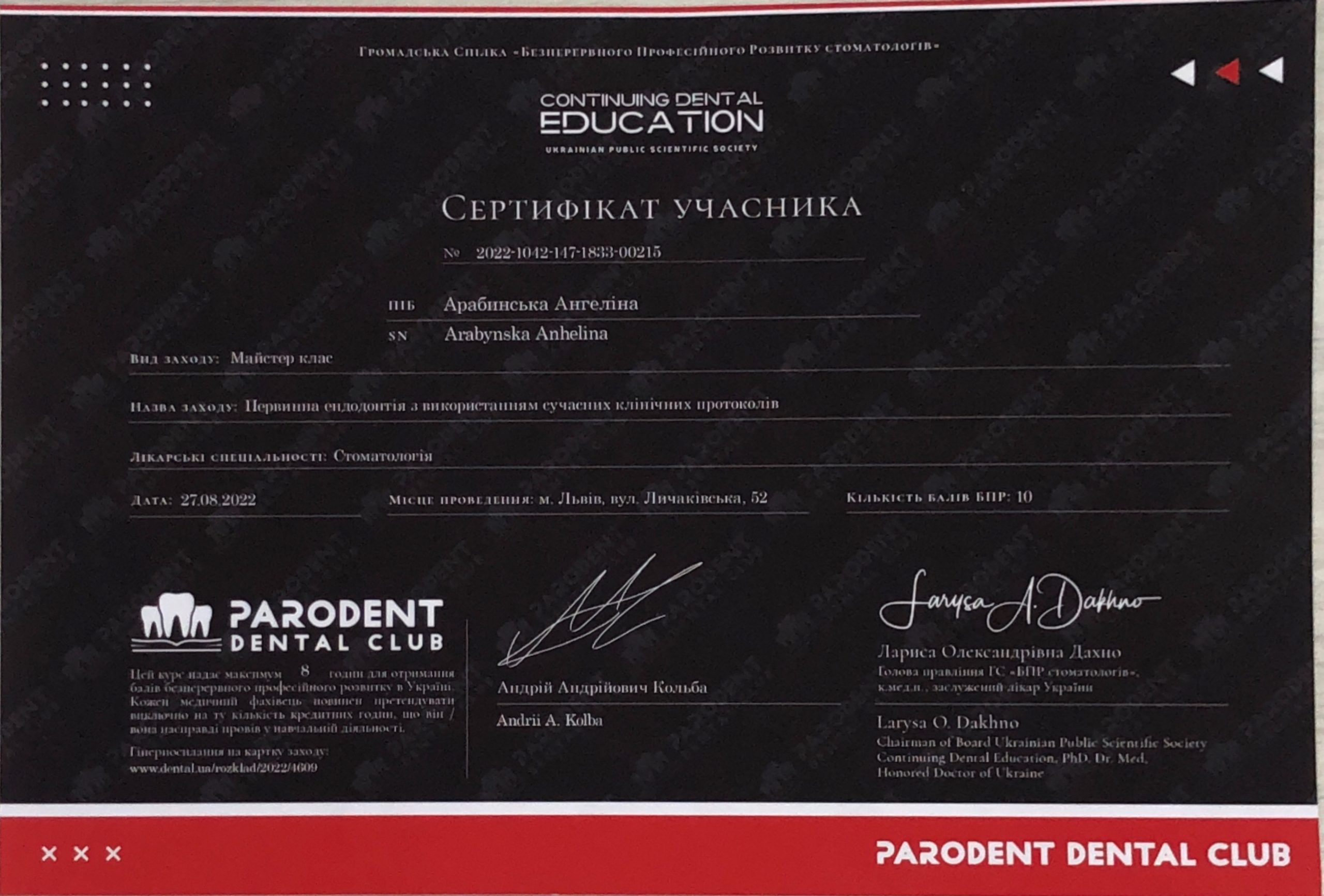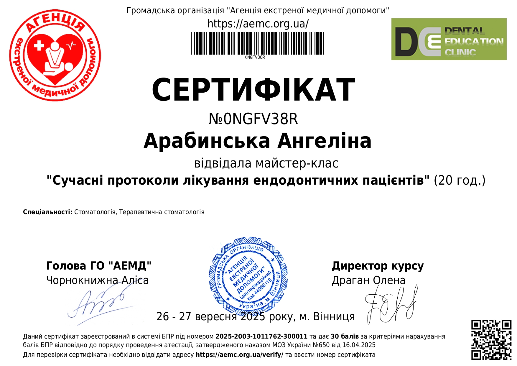 2025 год – «Современные протоколы лечения эндодонтических пациентов» Dental Education Clinic,курс Елены