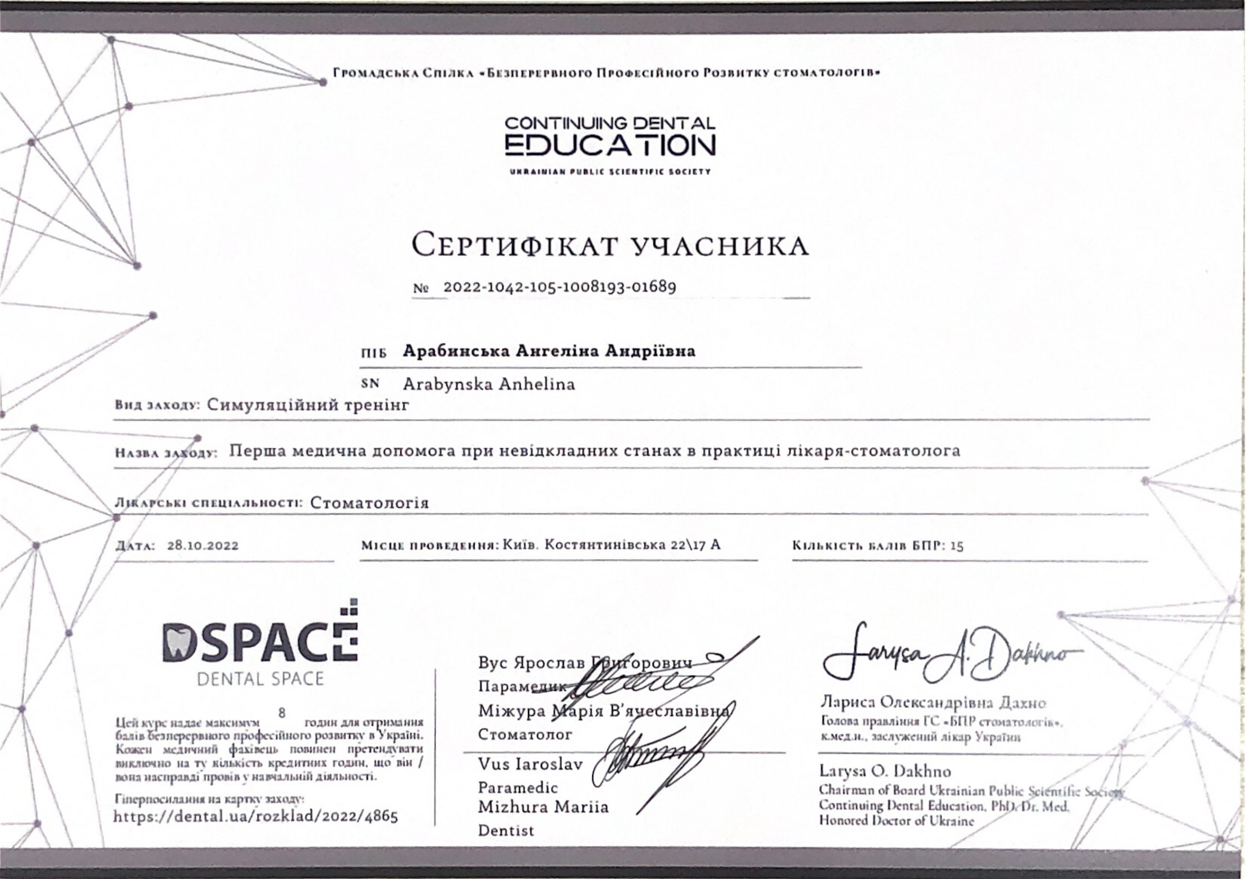 2022 год – «Первая медицинская помощь при неотложных состояниях в практике врача-стоматолога» учебный центр DSpace