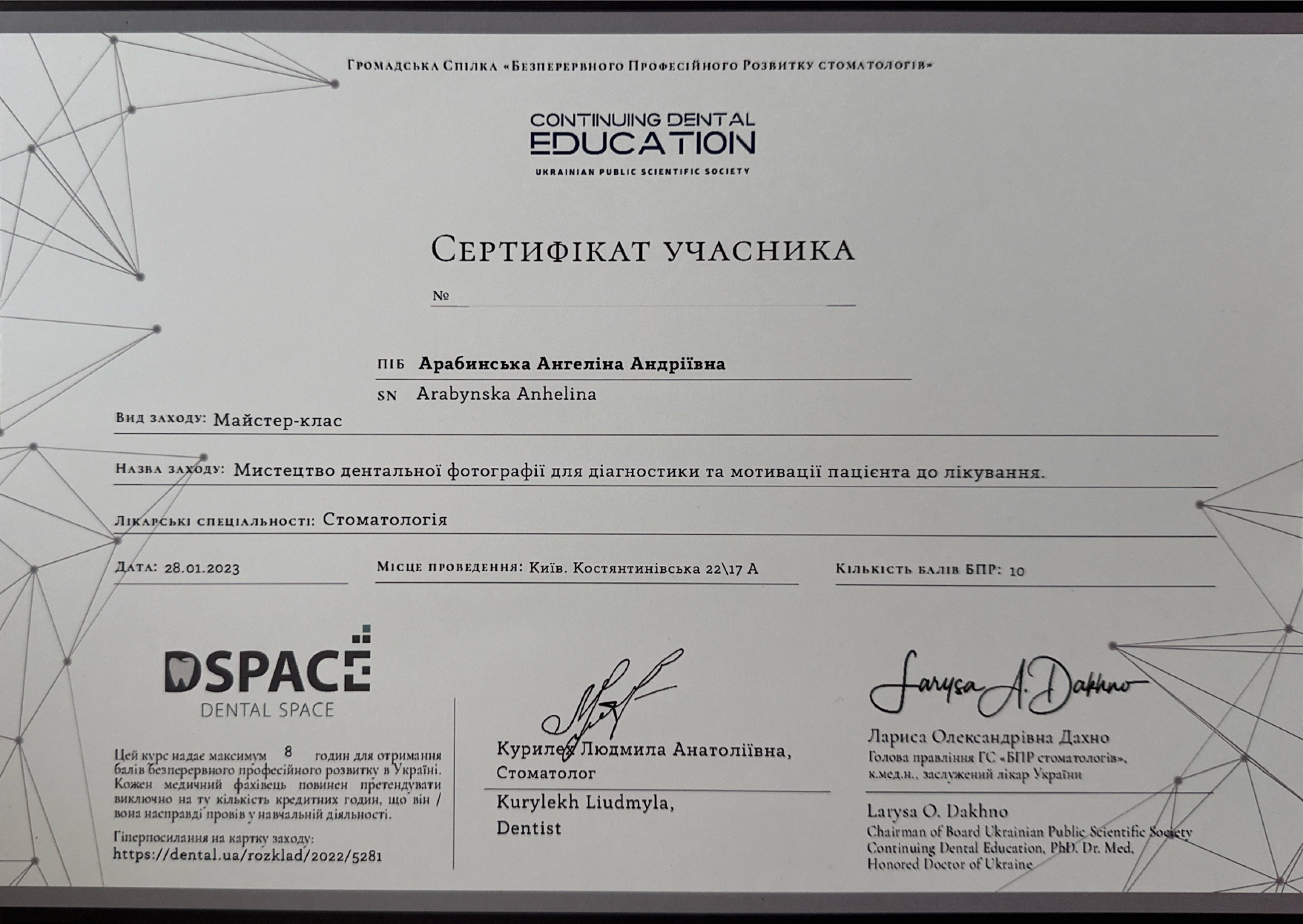 2023 год – «Искусство дентальной фотографии для диагностики и мотивации пациента к лечению» учебный центр DSpace